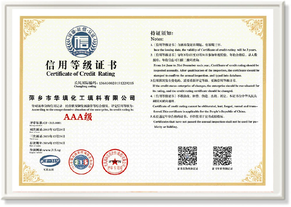 萍鄉(xiāng)市華填化工填料有限公司,位于320國道、109國道、浙贛鐵路、昌金高速公路貫穿其中,交通便利,是江西西部一顆燦爛明珠,創(chuàng)建于20世紀70年代初期,是中國石油天然氣股份有限公司“能源一號網(wǎng)”會員企業(yè)、中國石化物資采購電子商務網(wǎng)絡和中國海洋石油總公司采辦業(yè)務系統(tǒng)成員單位,是上海大學江西材料基因組工程產(chǎn)業(yè)研究院工業(yè)陶瓷產(chǎn)業(yè)創(chuàng)新聯(lián)盟基地,且通過ISO9001:2015質(zhì)量管理體系、ISO14001:2015環(huán)境管理體系、ISO45001:2018職業(yè)健康安全管理體系認證的化工填料生產(chǎn)企業(yè)。公司擁有陶瓷、塑料、金屬填料、催化劑、活性氧化鋁、分子篩等產(chǎn)品生產(chǎn)線,現(xiàn)有固定資產(chǎn)3616萬元,占地面積3.8萬平方米。公司具有悠久的生產(chǎn)歷史、雄厚的技術(shù)力量和先進的生產(chǎn)工藝設備,可生產(chǎn)工業(yè)瓷球(支撐劑)、陶瓷、金屬、塑料質(zhì)的規(guī)整、散堆化工填料及分子篩、催化劑、生化濾料、活性氧化鋁、石化助劑、活性炭、環(huán)保材料、耐火材料等系列的200多種規(guī)格型號產(chǎn)品。